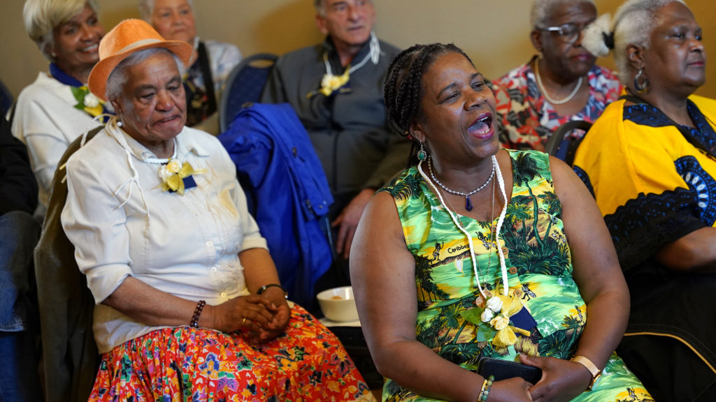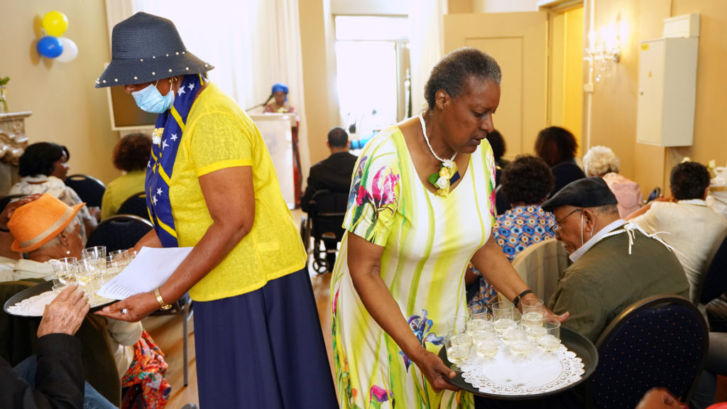 ‘Er is nog een ding dat de Surinamers met de Curaçaoërs gemeen hebben’, besluit ze haar verhaal. ‘Lekker eten en feest vieren!’. Nu klinkt er gejuich van herkenning. De alcoholvrije bubbels gaan rond en er wordt geproost: ‘Op onze vlag, viering en vrijheid! Salut!’. Daarna wordt het volkslied door alle aanwezigen uit volle borst meegezongen. Hoewel de voertaal op deze bijeenkomst Nederlands is, zodat alle aanwezigen het kunnen verstaan, wordt er gebeden en gezongen in de hartstaal, het Papiaments. Ook door de 22-jarige Miss Universe Curaçao en studente Social Work, Kanisha Sluis uit Rotterdam, die hier vandaag veruit de jongste is. Ze is gevraagd om te vertellen over haar drive: Antilliaanse meiden ervan bewust maken dat ze trots moeten zijn op zichzelf en hun afkomst.