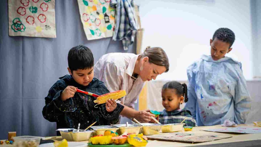 Ook voor kinderen was het een leuke middag. Zo konden ze zelf hun eigen tas bedrukken met stempels van paprika’s, mini-peertjes en andere verse groente- en fruitsoorten als herinnering aan de middag. Tijdens de speciale Kunst en Knutselpret-les van 7 november hadden kinderen met juf Jessica al kunstwerken gemaakt over hun favoriete gerechten. Deze kleurrijke creaties hingen in de bibliotheek en maakten de knutselhoek extra gezellig.