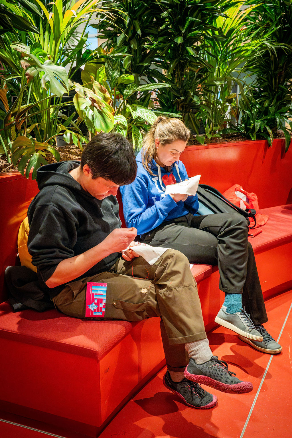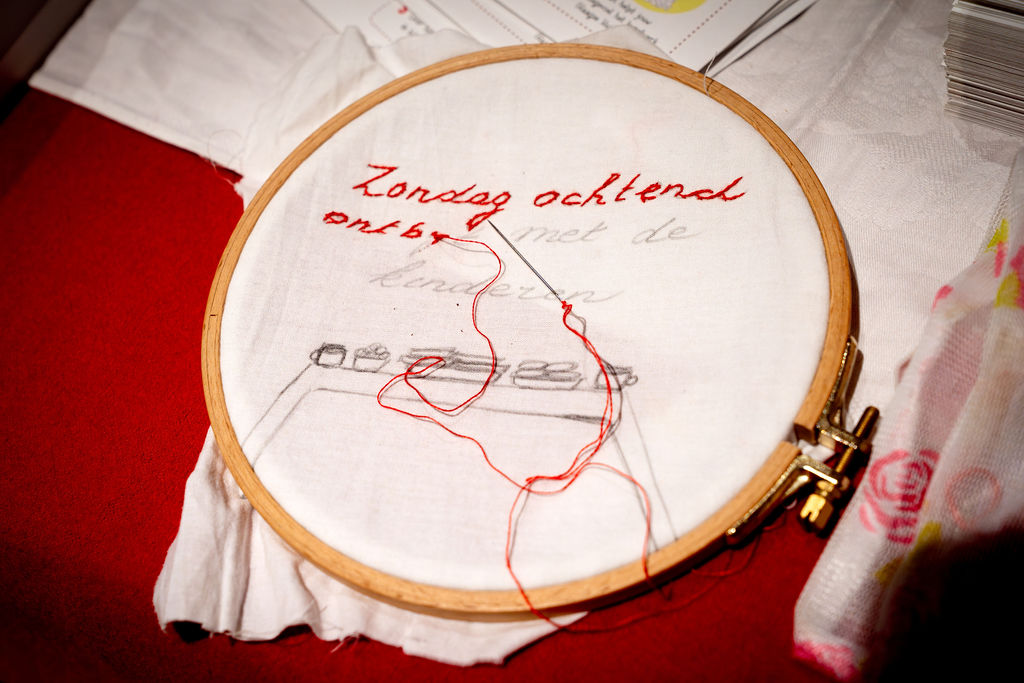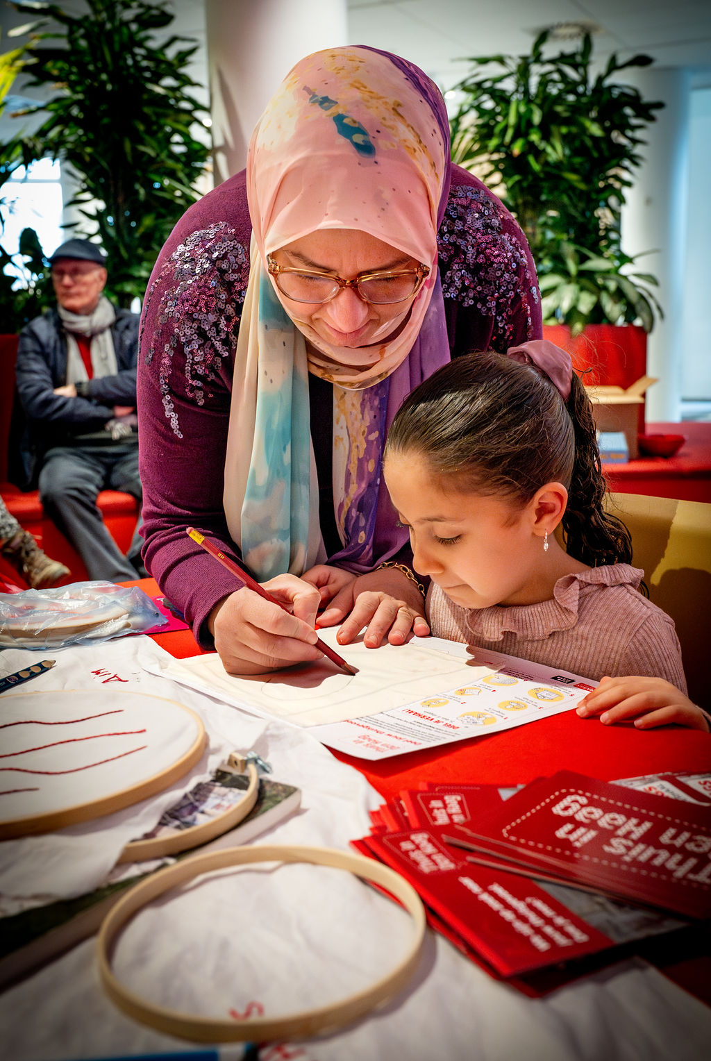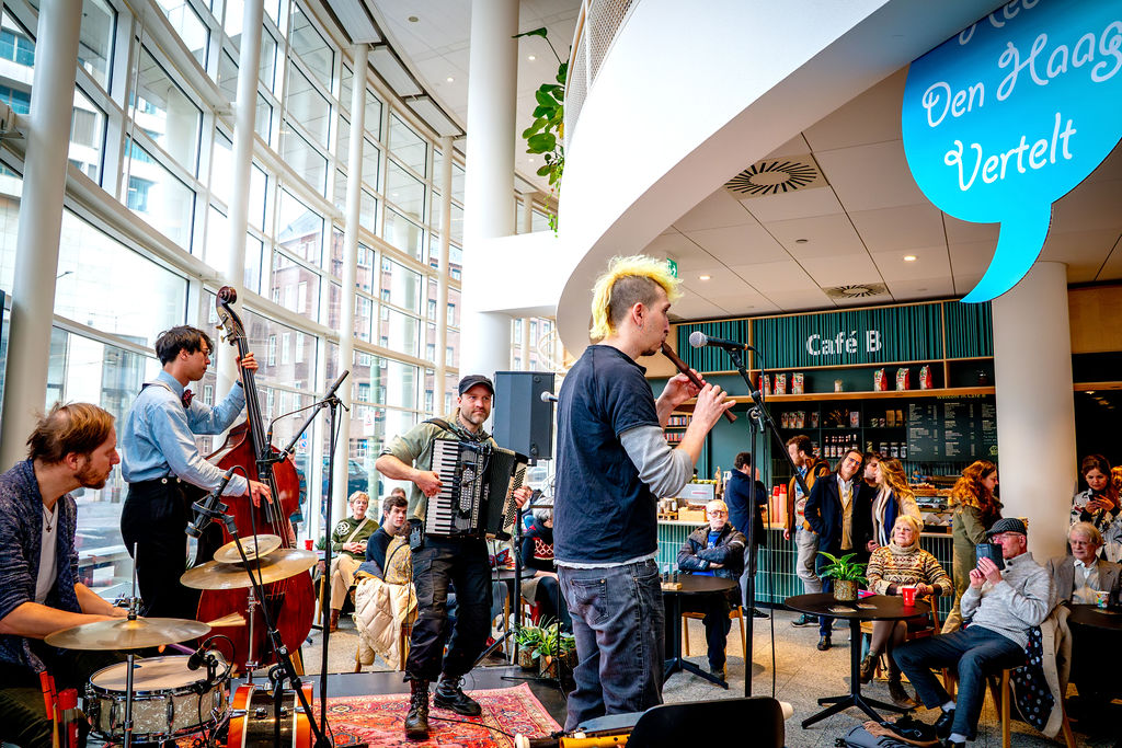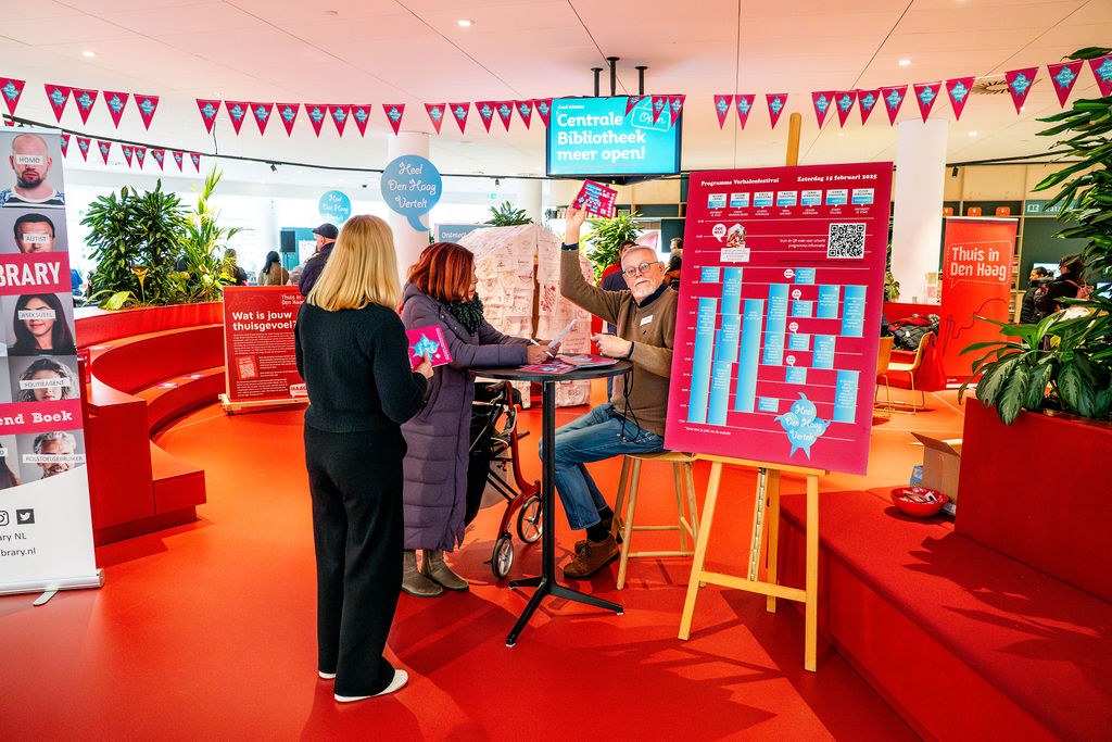 De muzikale aftrap kwam van Klezmer-orkest Klezkopf. Met de accordeon, fluit, contrabas en percussie vertelden zij hun verhaal. Later borduurden ze hun thuisgevoel bij het borduurproject Thuis in Den Haag, dat direct bij binnenkomst op de rode middenstip stond en zorgde voor een warm onthaal voor alle bezoekers van de bibliotheek. Groot en klein kon hier terecht om te praten over hun thuisgevoel en er een lapje van borduren. Zo droegen ze bij aan een kunstwerk over thuisgevoel dat door de stad trekt.