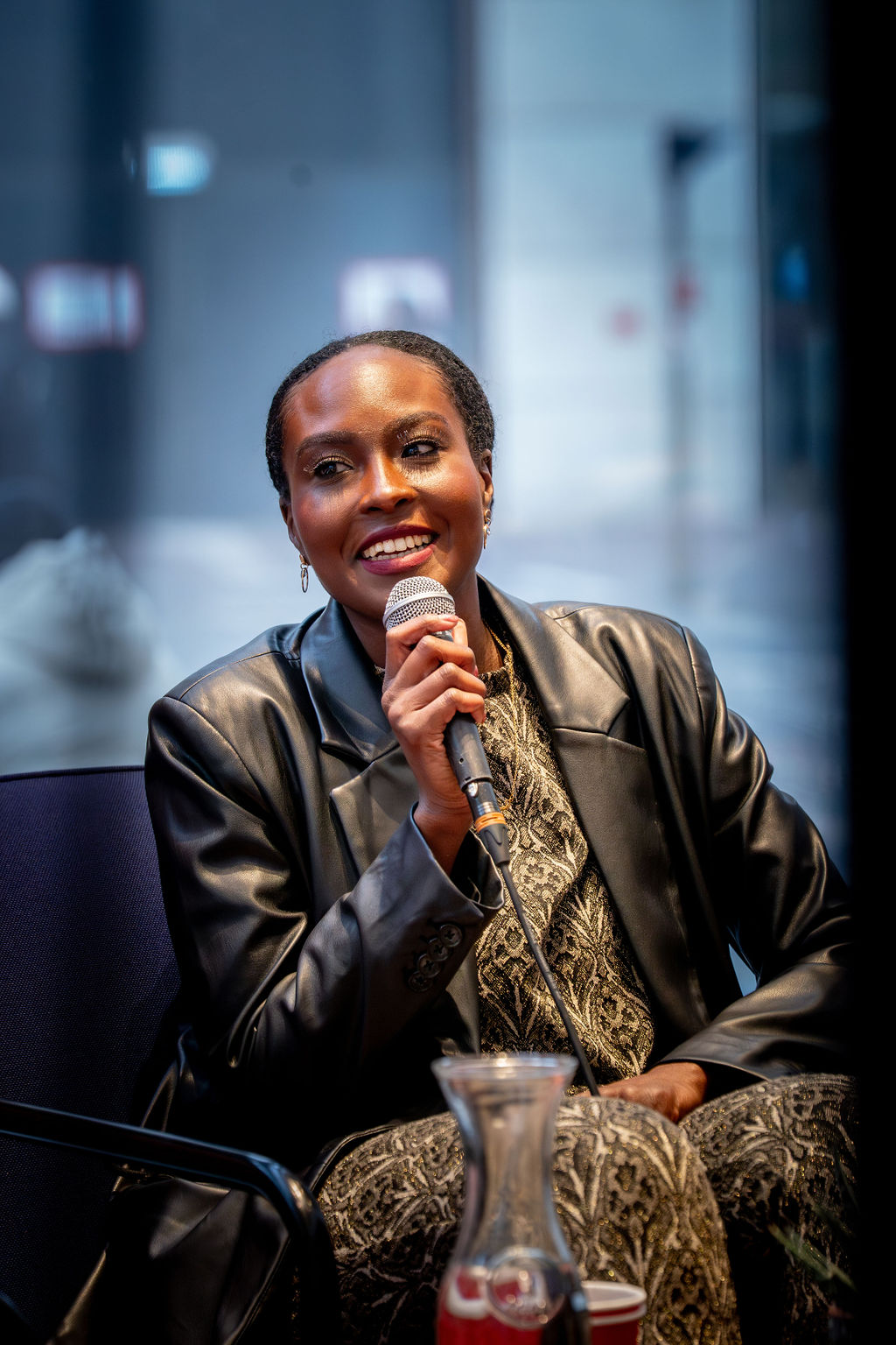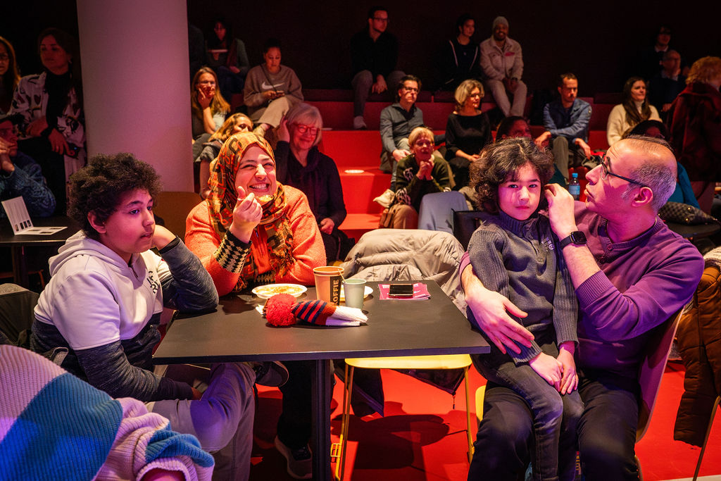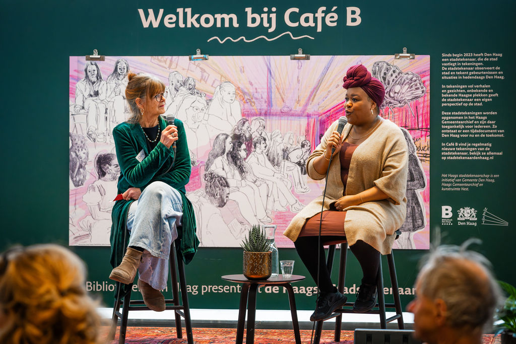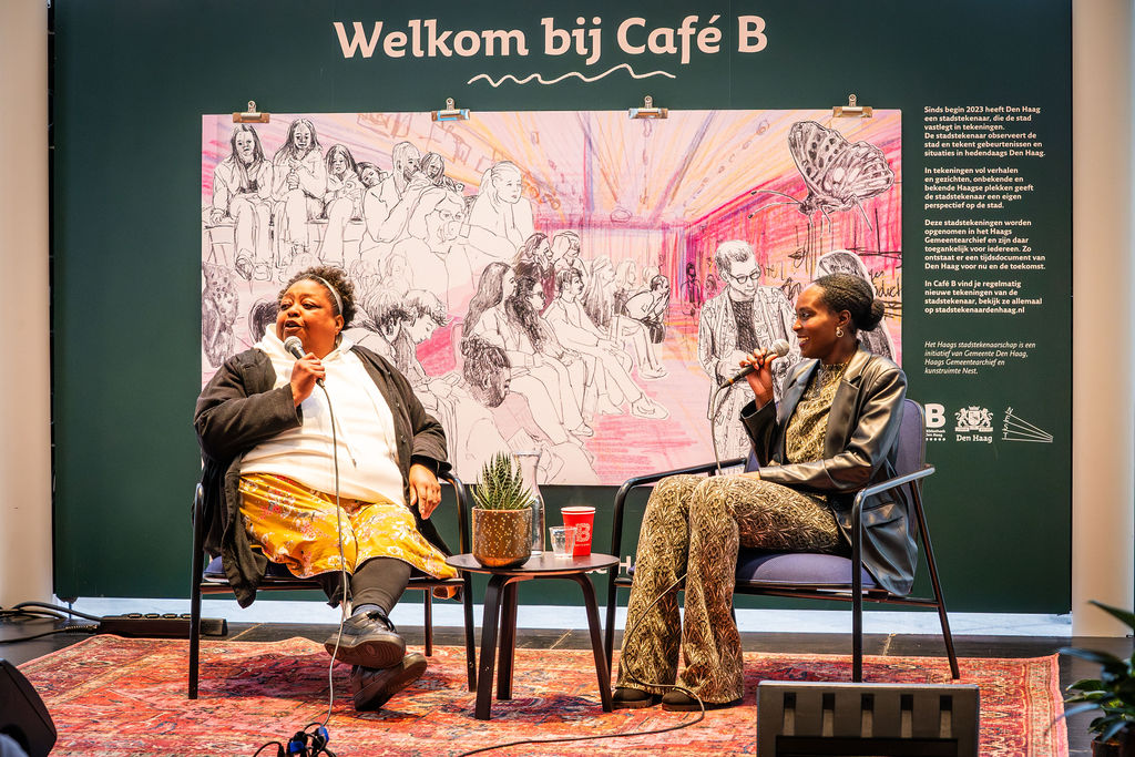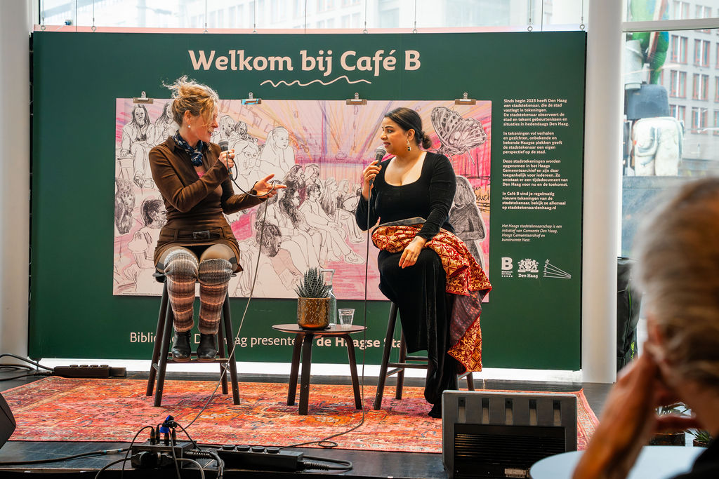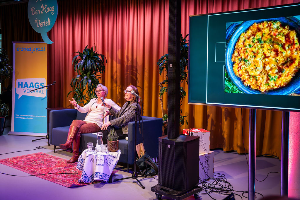 Op een verdieping hoger kwamen de heerlijke wereldse geuren en het gelach je tegemoet uit Studio B. Hier waren de Eetverhalen uit de Egyptische, Iraanse en Caribische keuken. Iedereen genoot van de smakelijke proeverijtjes die de vertellers hadden gemaakt. Er werden tips uitgewisseld van de beste Iraanse restaurants in Den Haag, de beste kruiden om mee te koken en heerlijke recepten werden gekoppeld aan persoonlijke verhalen. De positieve warme sfeer zorgde voor verbinding, herkenning en gezelligheid.