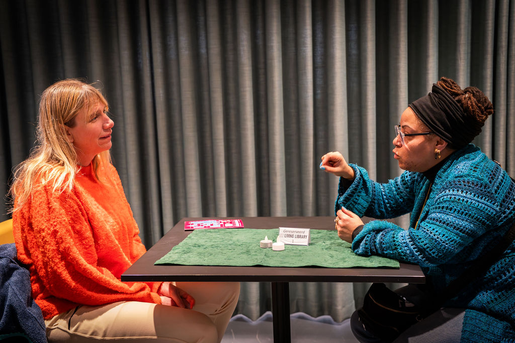 Op de eerste etage werd de ‘open library’ druk bezocht, ‘de mens als open boek’. Men kon kiezen om iets over iemand te weten te komen, door eenvoudigweg aan te schuiven aan een tafeltje. Zo gingen bezoekers in gesprek met personen met ervaring als transgender, erotische begeleiding, autisme, detentie of adoptie.